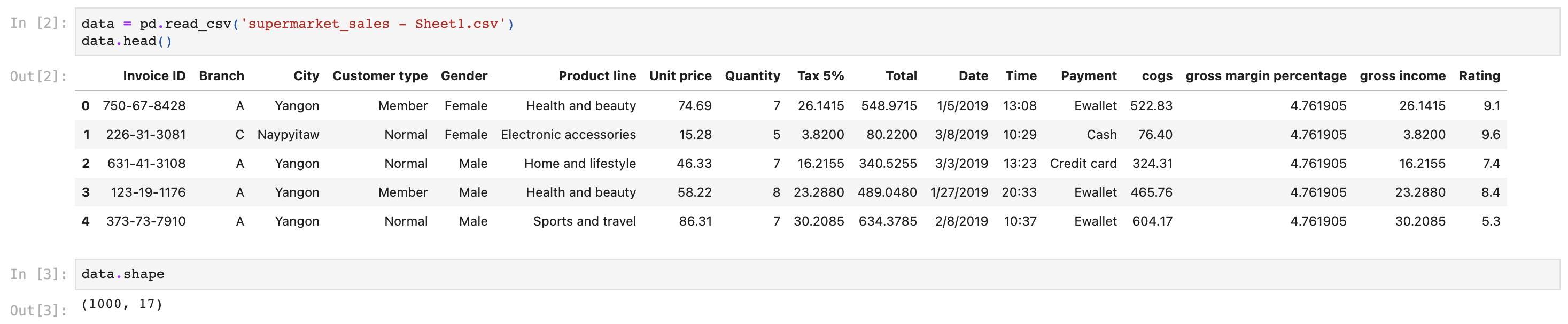 해당 데이터는 Supermarket의 판매 품목과 판매액을 나타내고 있는 데이터로, 1000개의 row와 17개의 column로 이루어져 있다.