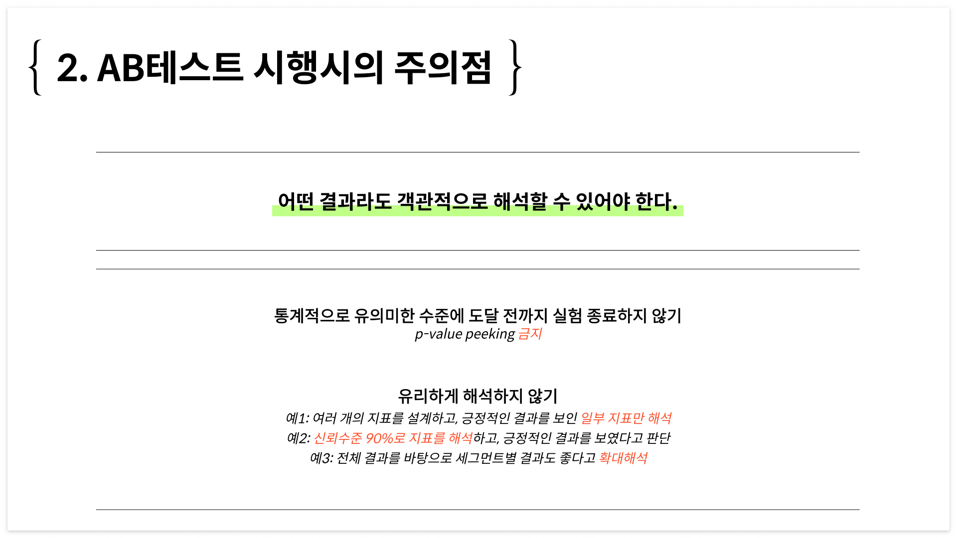 AB테스트 시행 시의 가장 중요한 주의점입니다. 실험 결과가 어떻게 나오더라도 객관적으로 해석할 수 있어야 합니다. 우리 솔직해집시다. 우린 우리가 세운 가설이 참이면 좋겠어요. 우리가 노력해서 열심히 만든 기능인만큼 고객들이 좋아해 줬으면 좋겠어요. 우리 제품이 시행착오 없이 단번에 고객의 사랑을 받았으면 좋겠어요. 당연합니다. 저 또한 그래요. 하지만 명심해야 해요. 우리는 '고객들이 원하는 게 무엇인지 알기 위해서' AB테스트를 하는 것이지, '우리 아이디어가 맞았다고 짜맞추기 위해서' AB테스트를 하는 것이 아닙니다. 실험 결과에 주관적 해석이 들어간다면 단기적으로는 행복할지라도, 장기적으로는 고객과 점점 멀어질 거예요.